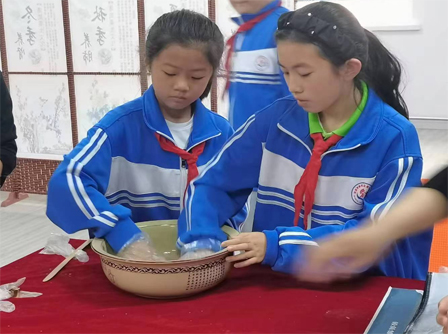 在初步了解了家乡这项国家级非物质文化遗产之后,同学们便动手实践,他们亲自动手和面、压制香条、理香、盘香,让香粉在自己手中逐渐成型。